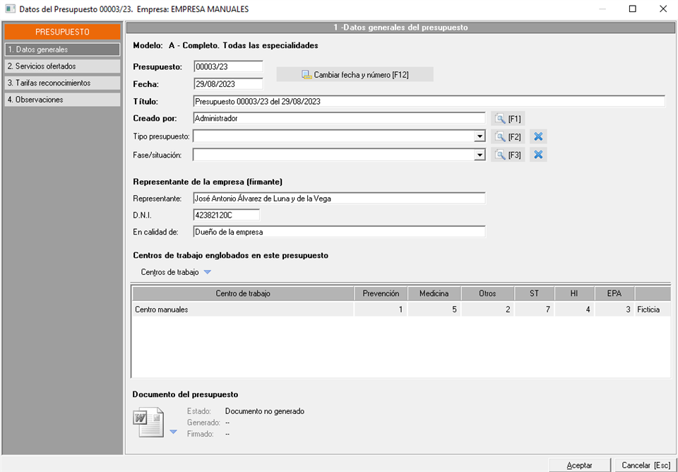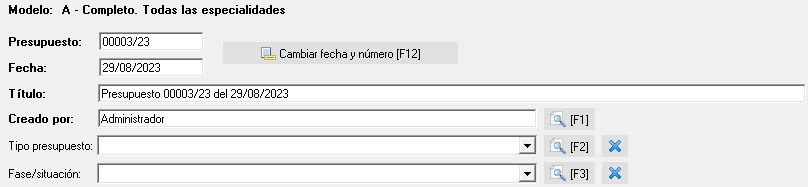 El primer bloque engloba los datos identificativos del presupuesto, fecha y tipología: