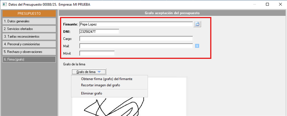 En esta pestaña definiremos los datos y firma del precliente, tal y como vemos en la siguiente imagen: