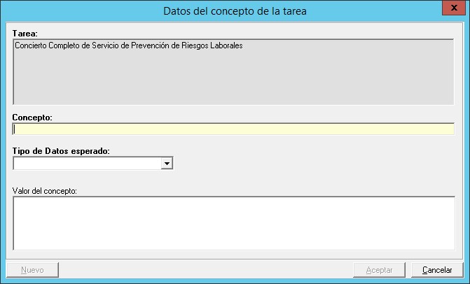 El botón “Nuevo” da acceso a la ficha para el registro del concepto, dónde ha de cumplimentar los campos “Concepto”, “Tipo de Datos esperado” y “Valor del concepto” para habilitar el botón