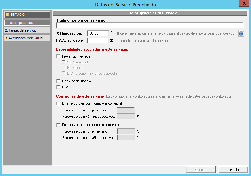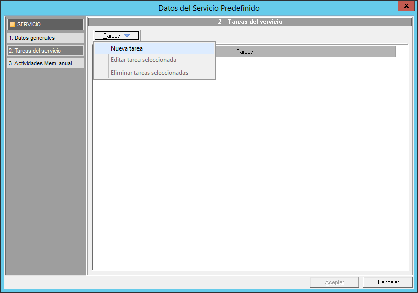 Añadidos los servicios puede editarlos con el menú 'Servicios > Editar servicio seleccionado' obteniendo acceso a las pestañas "1. Datos generales" y "2. Actividades Mem. anual". Los menús "Tareas" y "Conceptos" permiten la edición de tareas y conceptos, tal y como se ha indicado en el apartado "2.2. Tareas del servicio".