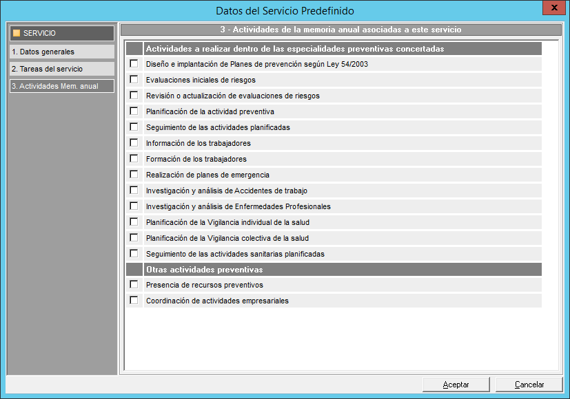Permite la asignación de actividades de la memoria Orden TIN al servicio, que luego repercute en la generación de la memoria con Prevengos mediante la herramienta “Memorial anual Orden TIN”.