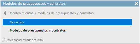 Configurados los servicios predefinidos, puede generar modelos para los presupuestos y contratos con el fin de realizar este proceso más rápido mediante el menú 'Mantenimientos > Modelos de presupuestos y contratos > Modelo de presupuestos y contratos'.