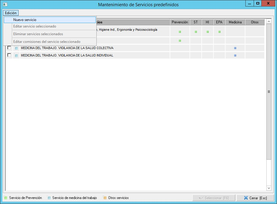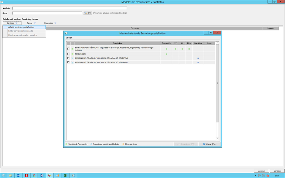 Prevengos puede generar, gestionar y facturar contratos, pero ha de configurar los servicios en el menú Mantenimientos > Modelos de presupuestos y contratos > Servicios.