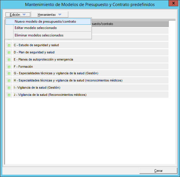 Mantenimiento de servicios predefinidos. Modelos para presupuestos y contratos.