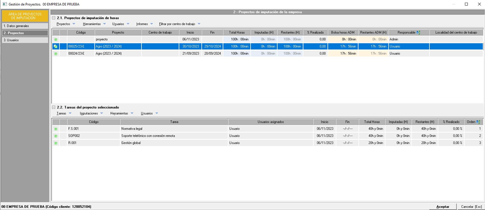 Centrándonos en la pestaña principal, Proyectos, vemos que está dividida en dos partes. Una parte superior donde se indican los proyectos de imputación existentes en las empresas y una parte inferior donde se muestran las tareas existentes en los proyectos que tengamos seleccionados en la parte superior. Vamos a desglosar ambas partes para ver todas las herramientas masivas y desplegables de los que disponemos.