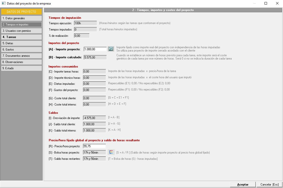 - [S] - Bolsa horas proyecto. Horas que se asignan al proyecto y que se calculan dividiendo el importe del mismo entre el precio por hora indicado en el campo anterior. La operación es [A] / [R]