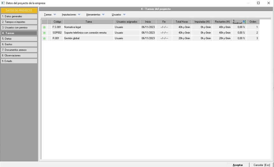- Tiempos imputados. Campo que indica, a nivel informativo, el total de imputaciones realizadas en las tareas del proyecto.