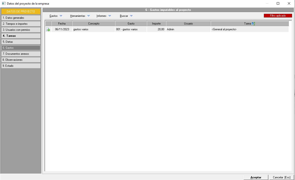 - [F] - Gastos del proyecto. Igual que el anterior, sumatorio de gastos imputados en el proyecto y sus tareas en el apartado que veremos más tarde.