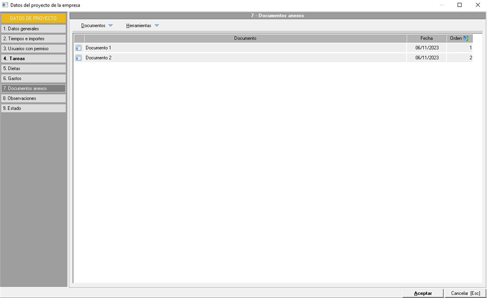 - [E] - Dietas imputadas. Sumatorio de todas las dietas imputadas en el proyecto y en las tareas del mismo, en su apartado correspondiente que veremos más adelante.