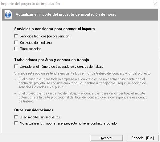 Dentro de esta ventana establecemos los importes que se tienen que considerar y que trataremos en la siguiente pestaña de "Tiempos e importes". Aquí podemos elegir que especialidades de servicios queremos considerar para el cálculo del importe a considerar para el proyecto, pudiendo elegir entre servicios técnicos, servicios de medicina u otros servicios. También podemos considerar el número de trabajadores y centros de trabajo en función de los incluidos en el contrato y el establecido en el proyecto. Por último podemos elegir si usamos los importes con o sin IVA y poder no actualizar los importes si el proyecto no tiene contrato asociado.