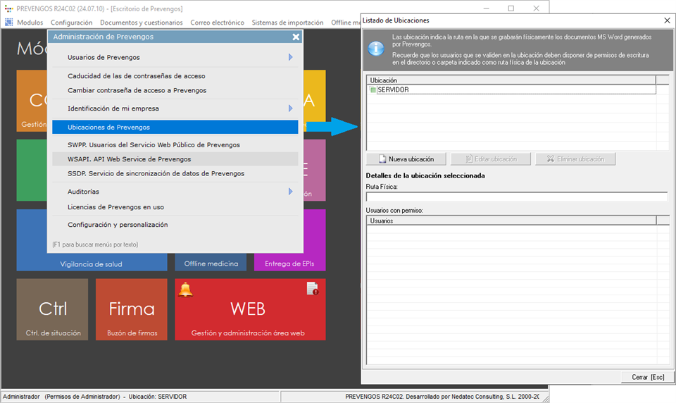 Esta ubicación de Prevengos se configura durante el proceso de instalación del programa y no suele cambiarse nunca a no ser que se realice un cambio de servidor, en cuyo caso se debe de modificar. Si no sabe dónde está ubicado lo puede comprobar en el menú de configuración indicado en la siguiente imagen (tenga en cuenta que solo puede acceder a dicha configuración un usuario Administrador)
