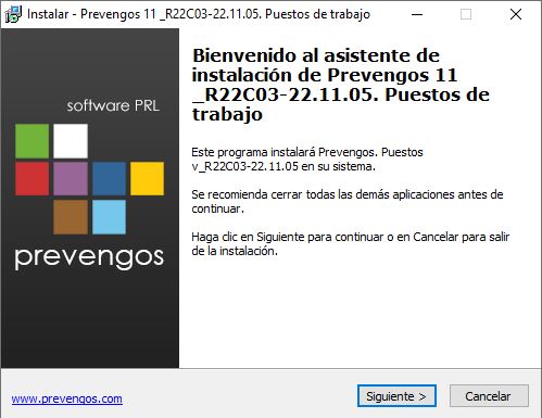 Dentro de esta primera ventana del asistente nos da las primeras indicaciones en el proceso de instalación, como tener cerrado Prevengos así como aplicaciones secundarias del mismo (gestor de impresión, módulo web,....). Una vez estemos seguros de tenerlo todo cerrado, haremos clic en el botón Siguiente > pasando a la siguiente pantalla: