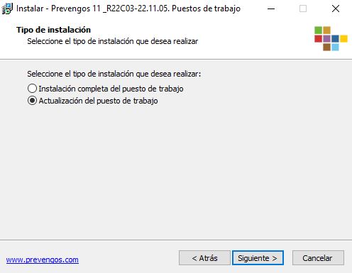 En esta ventana tenemos que elegir si vamos a instalar Prevengos por primera vez o vamos a actualizarlo. Debemos tener especial atención dado que la opción que aparece marcada por defecto es la de actualización, la cual nos dará problemas si no tenemos Prevengos instalado y tampoco instalará los componentes necesarios para la ejecución de Prevengos. Una vez marquemos la opción correcta haremos clic sobre el botón Siguiente > y veremos la siguiente pantalla: