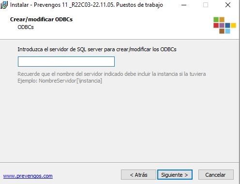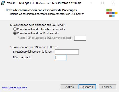 Esta ventana es muy importante, ya que se establecen los datos de conexión con la base de datos de Prevengos. Cuando actualizamos el puesto de trabajo este campo aparece rellenado con los datos existentes, por lo que no hay que tocar nada. En caso de una instalación nueva, debemos establecer la ruta de conexión estableciendo el nombre del servidor y el nombre de la instancia, de esta manera: