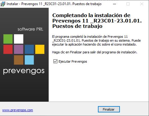 Una vez cumplimentado finalizaremos la instalación siguiendo los pasos en pantalla, el proceso puede demorarse unos minutos en función de la potencia del equipo mientras se copian los ficheros y se registran las librerías. Una vez finalizada la instalación se mostrará esta ventana y podemos ejecutar Prevengos: