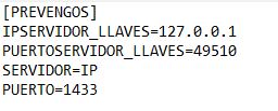 Centrándonos en el puesto de trabajo que muestra el error, el primer paso es comprobar que está intentando conectar con el servidor correcto (para ello deberemos de saber la IP donde está dicho servidor). Para comprobarlo accederemos a la carpeta donde está instalado Prevengos (por defecto C:\Program Files (x86)\Prevengos) y buscaremos un fichero llamado Iniserver.ini el cual abriremos con el bloc de notas (o Notepad), mostrándose un texto similar al siguiente: