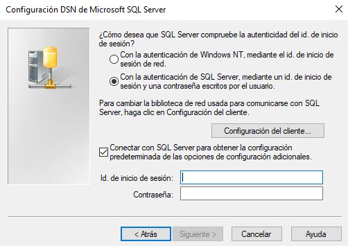 Dentro de esta ventana dejaremos marcada la opción Con la autentificación de SQL Server, mediante un id. de inicio de sesión y una contraseña escritos por el usuario marcada tal y como se ve en la imagen superior.
