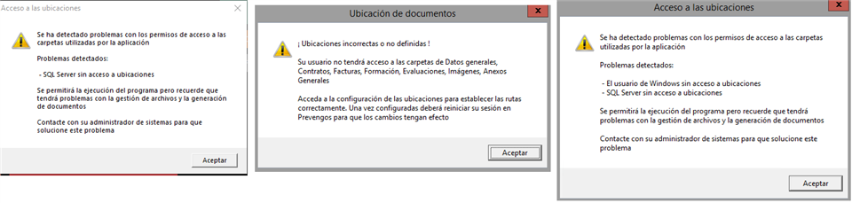 En alguna ocasión es posible que al acceder a Prevengos, tras introducir las credenciales y en la pantalla principal del programa, se nos muestre una serie de mensajes indicando que no hay acceso a las ubicaciones. La ubicación es aquella ruta a una carpeta (ubicada en el mismo equipo o en red) donde está la carpeta de documentación de Prevengos, la cual incluye todos los documentos que genera Prevengos así como las plantillas que se usan para ello. Cuando Prevengos inicia, comprueba que tiene acceso total a esta carpeta, lo cual es necesario para generar documentación, si no tiene acceso puede mostrar los siguientes mensajes: