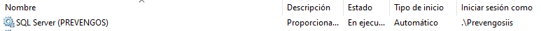 Dentro del servidor de Datos, localice el servicio de Windows correspondiente a la instancia de SQL, lo normal es que ésta se llama Prevengos y aparezca de una manera similar a la siguiente imagen: