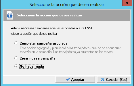 - Complementar campaña asociada. Si la PVSP seleccionada está vinculada a una campaña de reconocimientos médicos (PVST) y en la PVSP existen trabajadores que todavía no se han incorporado a la PVST, esta opción añadirá a esos trabajadores a la PVST creando así los reconocimientos médicos de los mismos, y además completará estos reconocimientos con los protocolos y pruebas que se hayan definido en la PVSP a los puestos de trabajo a los que esté relacionado el trabajador.