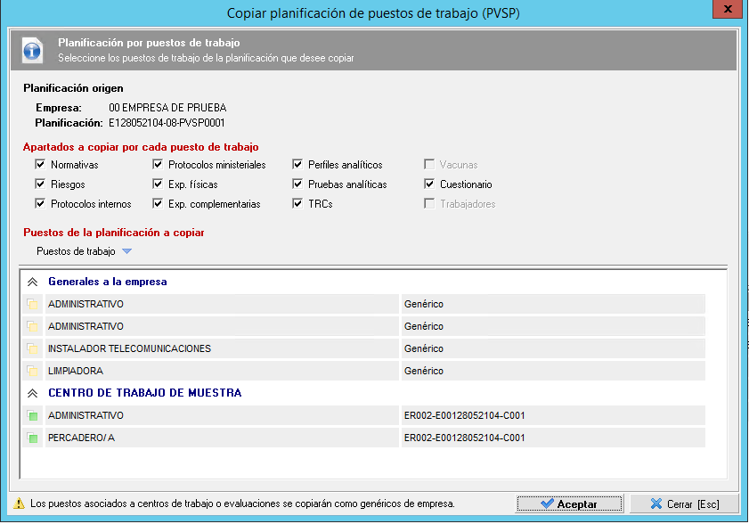 Si en la PVSP 'origen' hay puestos de trabajo de alguna evaluación de la empresa 'origen' estos pasarán a la nueva PVSP como puestos 'genéricos'.