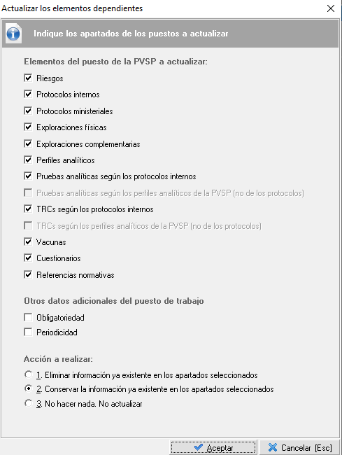 - Actualizar puestos seleccionados según la información de las EVRs. Esta herramienta sólo funciona con puestos de trabajo añadidos desde las evaluaciones asociadas a la PVSP. En este caso, esta opción actualizará los puestos de trabajo según los riesgos que estos tengan asociados a la evaluación, y en función de esos riesgos, podrá actualizar el resto de información relacionada al puesto, como por ejemplo, los protocolos, la obligatoriedad del reconocimiento, las exploraciones físicas o complementarias, o las analíticas. Todo dependerá de las opciones que el usuario seleccione en la pantalla de opciones que vemos a continuación.