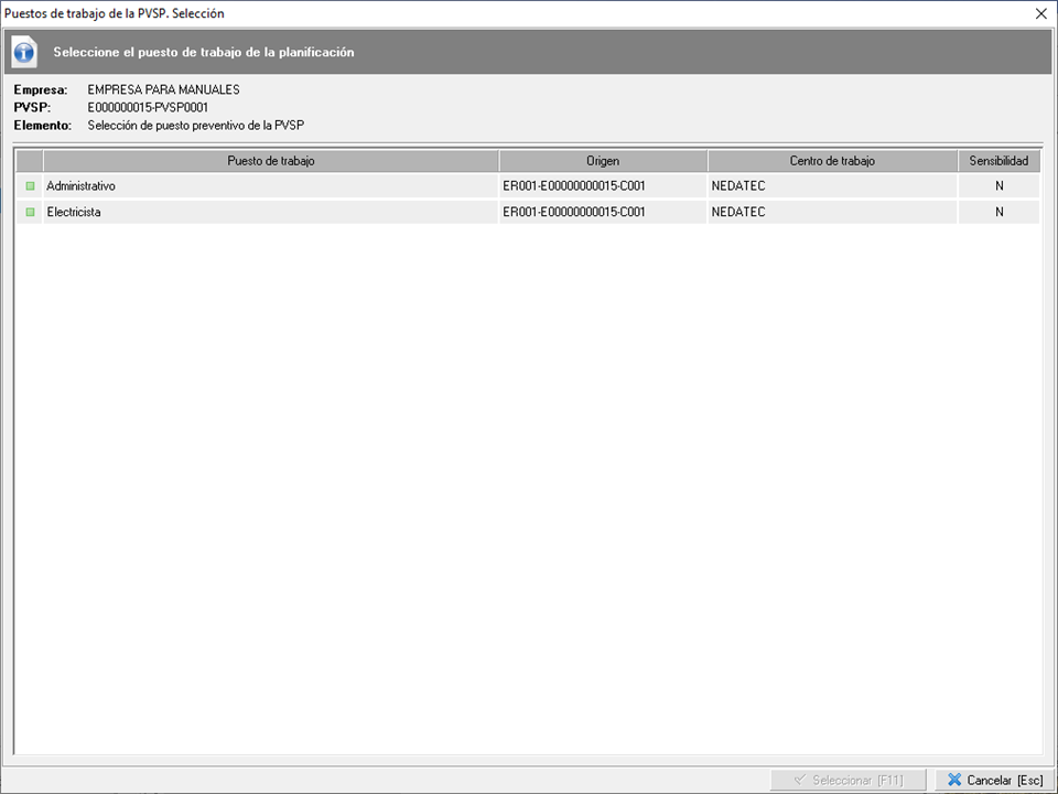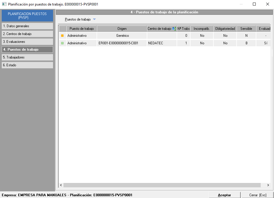Desde la ficha de datos de la PVSP, pestaña 4. Puestos de trabajo, tiene que añadir los puestos de trabajo preventivos desde el menú Puestos de trabajo > Añadir puestos preventivos (Puestos de las EVRs indicadas). Añadidos a la PVSP puede diferenciar genéricos y preventivos por la iconografía o la columna Origen.