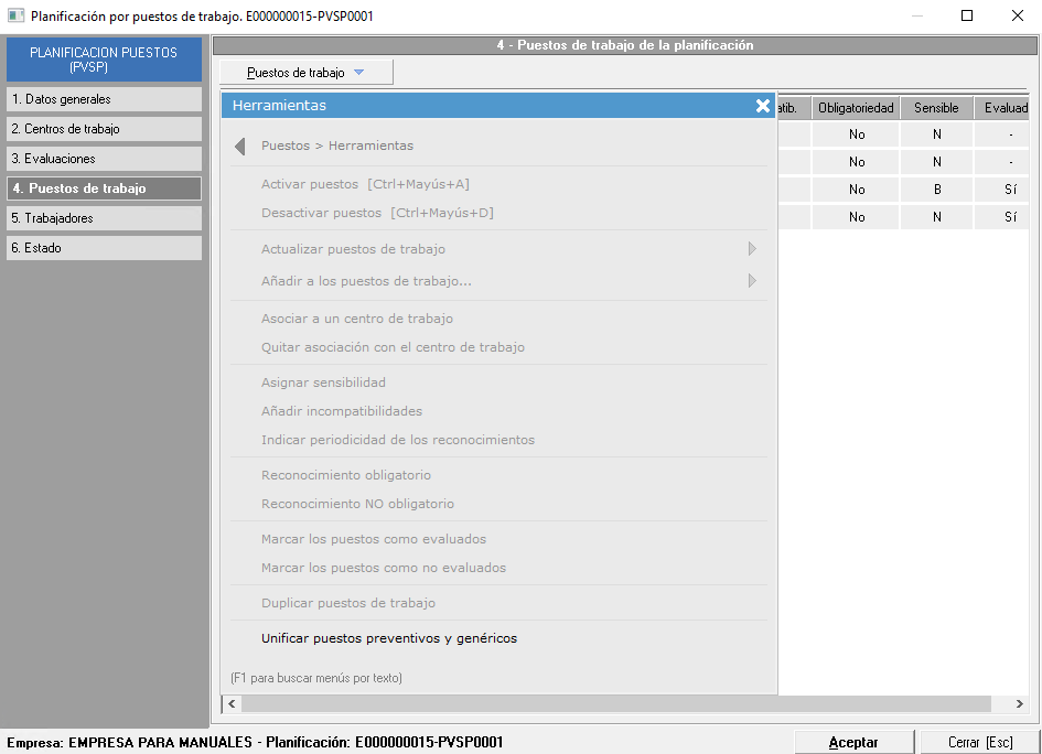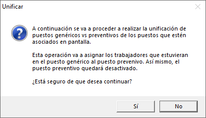 Para proceder a la unificación use el menú Puestos de trabajo > Herramientas > Unificar puestos preventivos y genéricos.