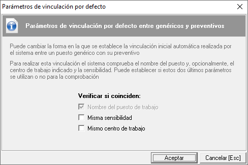 - Nombre del puesto de trabajo (siempre habilitado). Vincula si hay coincidencia entre el nombre del puesto genérico y preventivo, y en caso de existir más de 1 coincidencia realiza las siguientes comprobaciones para vincular:
