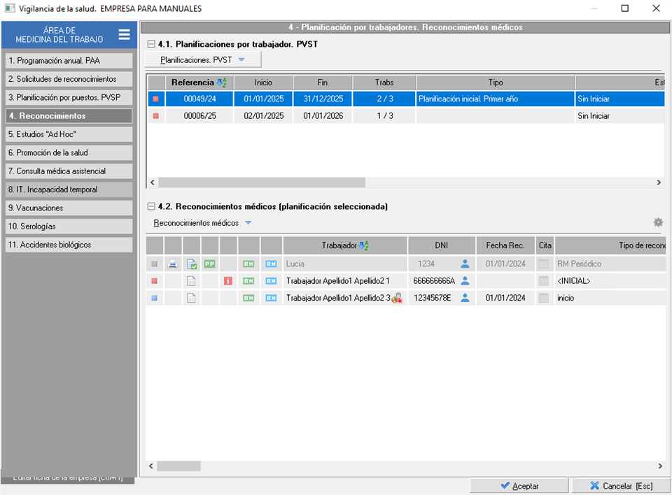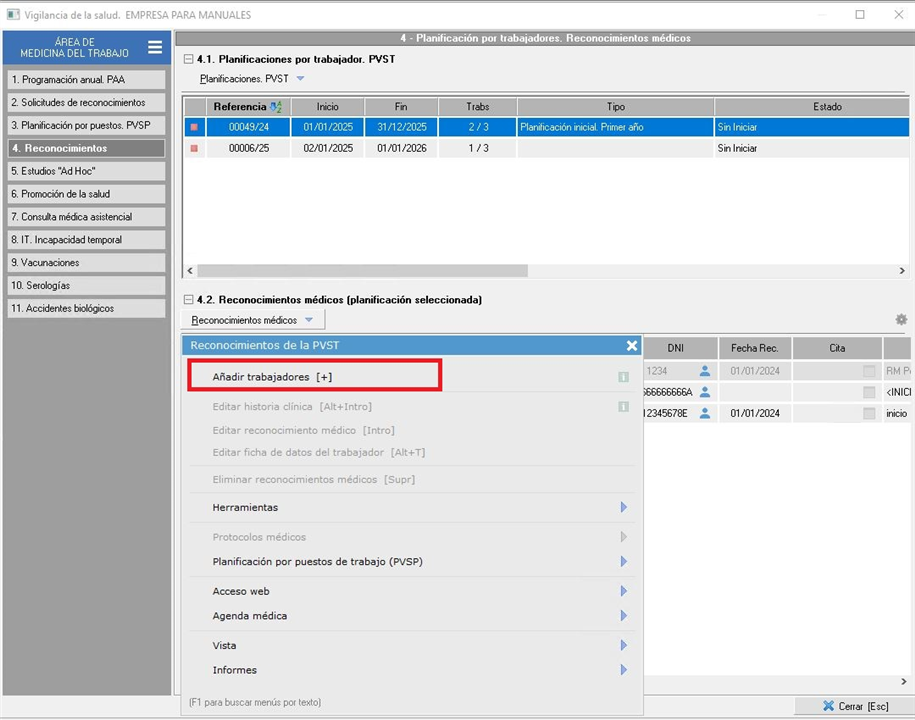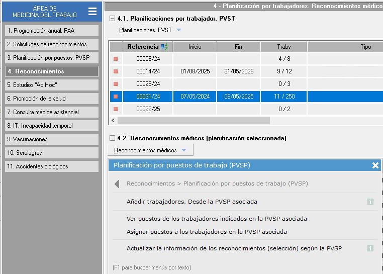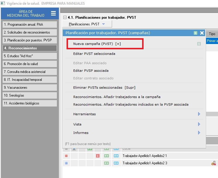 Lo más frecuente es que se cree una única planificación por periodo en la que se realicen los reconocimientos iniciales y periódicos, pero si se da alguno de los casos anteriores habría que crear nuevas PVST, ya que un trabajador sólo puede estar incluido una vez en cada PVST.