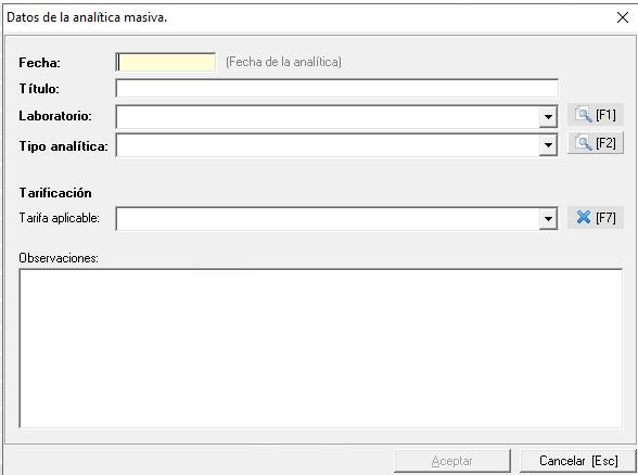 - Analíticas>Crear analíticas para los reconocimientos seleccionados. Con esta opción podrán generar pruebas analíticas para varios reconocimientos médicos a la vez. Una vez seleccionados los reconocimientos médicos, tendrán que pulsa la opción 'Crear analítica en los reconocimientos seleccionados'. A continuación les aparecerá un pequeño formulario donde tendrán que cumplimentar los datos en negrita (fecha, título, laboratorio y tipo de analítica) para posteriormente pulsar el botón 'Aceptar' para que Prevengos ejecute el proceso de generación de analíticas.