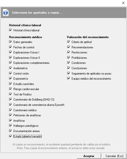 Al usar cualquiera de las dos herramientas de copia de reconcimientos médicos, hay que tener en cuenta que si el reconocimiento 'destino' tiene datos, estos se eliminarán y serán sustituidos por los datos del reconocimiento 'origen'.