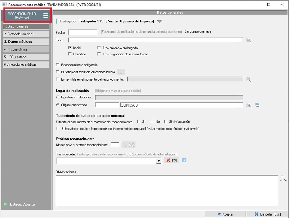 - Abrir/cerrar reconocimientos médicos. Un reconocimiento médico puede estar abierto o cerrado.