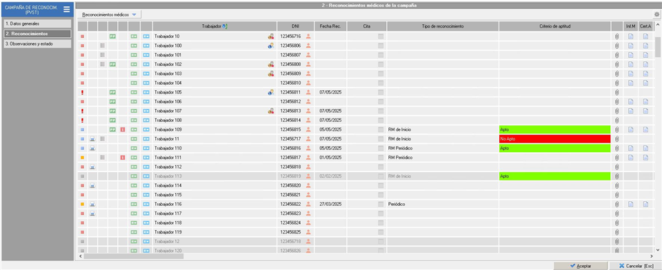 Una vez cargados los trabajadores en la PVST, obtendremos un listado de reconocimientos, que será visible tanto desde la ficha de la PVST como desde el listado de PVSTs de la empresa. Este listado presenta una iconografía en varias de sus columnas, que indicarán el estado de los reconocimientos médicos.