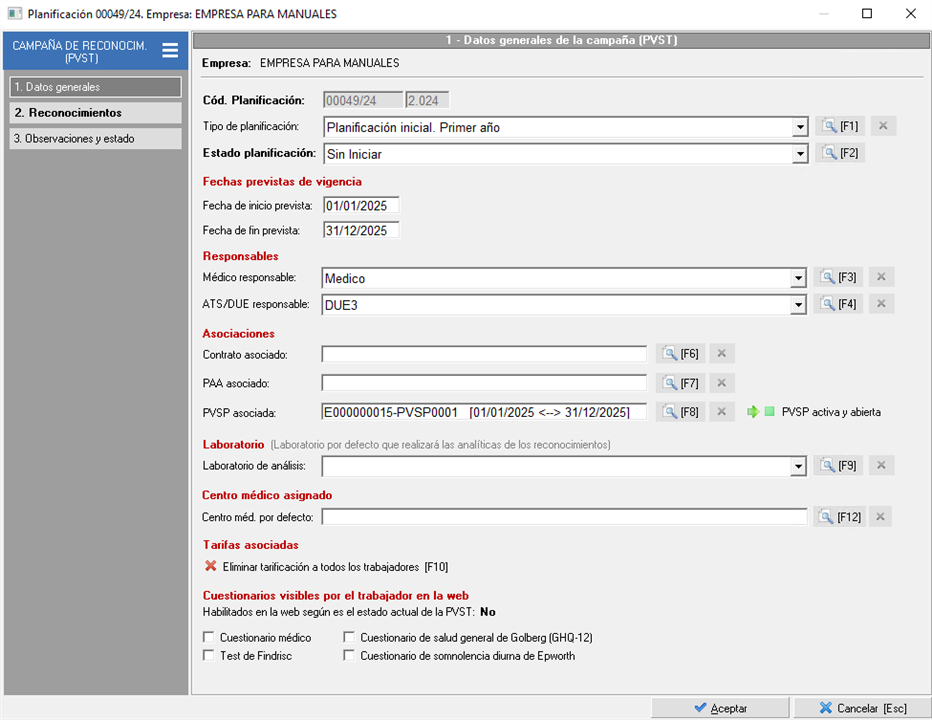 - Fechas de inicio y fin de la PVST. Marcan las fechas de vigencia de dicha PVST entre las cuales se realizarán los reconocimientos médicos. Serán útiles en los listados de las PVSTs, para que puedan identificar las fechas en las que se han realizado los reconocimientos médicos incluidos en cada PVST.