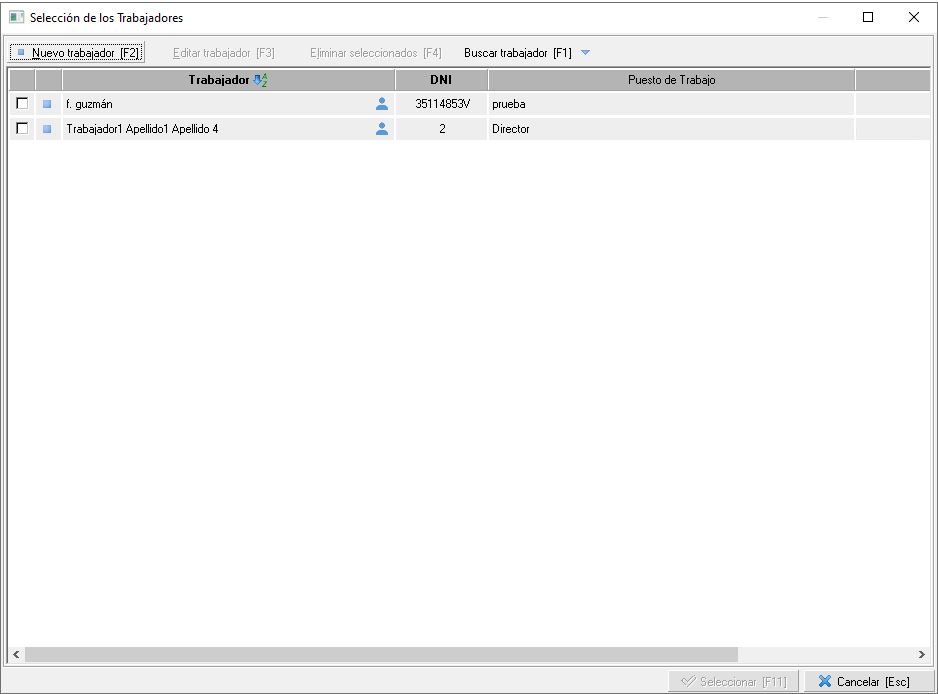 Cuando seleccionemos la opción 'Añadir trabajadores [+]' se accederá al listado de trabajadores de la empresa para seleccionar aquellos a los que queremos añadir a la PVST. Si el trabajador no existe, desde esa misma pantalla de selección podrán darlo de alta seleccionando la pestaña 'Nuevo trabajador [F2]'.