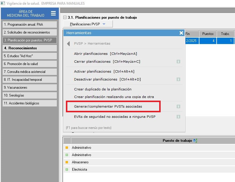 se seleccionará 'Herramientas'>'Generar/Complementar PVST asociada', como se muestra en la siguiente imagen. Esta herramienta les dará la posibilidad de generar o actualizar una PVST, en la cuál se añadirá un reconocimiento por cada trabajador asociado a los puestos de la PVSP y, además, a cada trabajador le asignará los protocolos y pruebas a realizar según esa PVSP.