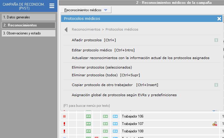 Al añadir trabajadores/reconocimientos a la PVST, Prevengos intentará cargar los protocolos a sus reconocimientos. Si hay PVSP asociada, intentará cargarlos desde la PVSP y, en caso contrario, utilizará la configuración del mantenimiento de protocolos. Si no se pueden cargar protocolos por ninguna de estas vías (por no haber configurado previamente el mantenimiento o no existir PVSP asociada), el usuario podrá utilizar las herramientas disponibles en la opción 'Protocolos' que encontrará en el desplegable