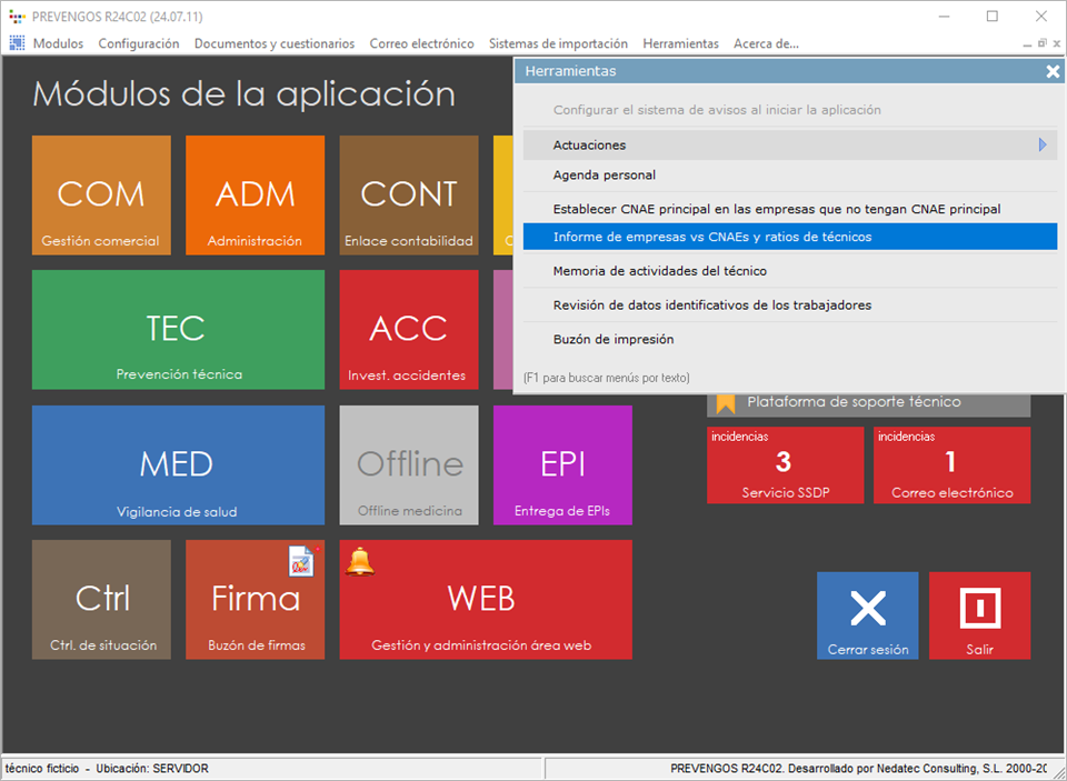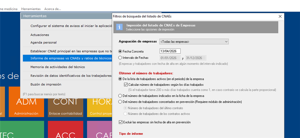 Para generar este informe, el usuario debe situarse en la pantalla principal de Prevengos, y desde el menú desplegable 'Herramientas' seleccionar la opción 'Informe de empresas vs CNAEs y ratios de técnicos'.