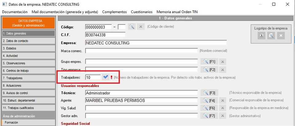 - Del número de trabajadores indicados en la ficha de la empresa. Se tomará el número de trabajadores indicado en el campo numérico que aparece en el apartado de 'Datos generales' de cada empresa.