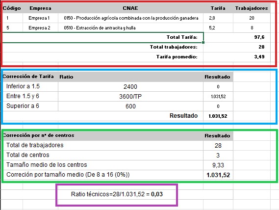 - Por último, en color morado, se muestra el resultado final del ratio de técnicos, dividiendo el número de trabajadores, entre el ratio. En el caso del informe general, este valor es el número de técnicos necesarios en el servicio de prevención, sin embargo, en el informe por técnico, es la carga de trabajo del técnico, si el valor para el técnico está por debajo de 1 significa que se le pueden asignar más empresas, mientras que si el valor está por encima de 1, quiere decir que el técnico tiene asignadas más empresas de las que puede atender.