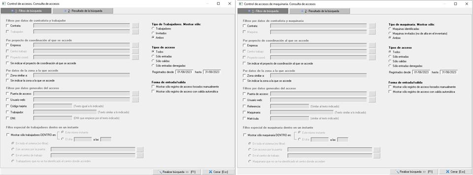 En el punto anterior comentamos que existen ambas consultas para obtener los registro de acceso, realmente comparten todos los filtros, la diferencia es que una nos da datos de trabajadores y la otra devuelve datos de maquinaria. En la siguiente imagen podemos ver una captura de ambas consultas, a la izquierda la de trabajadores y a la derecha la de maquinaria: