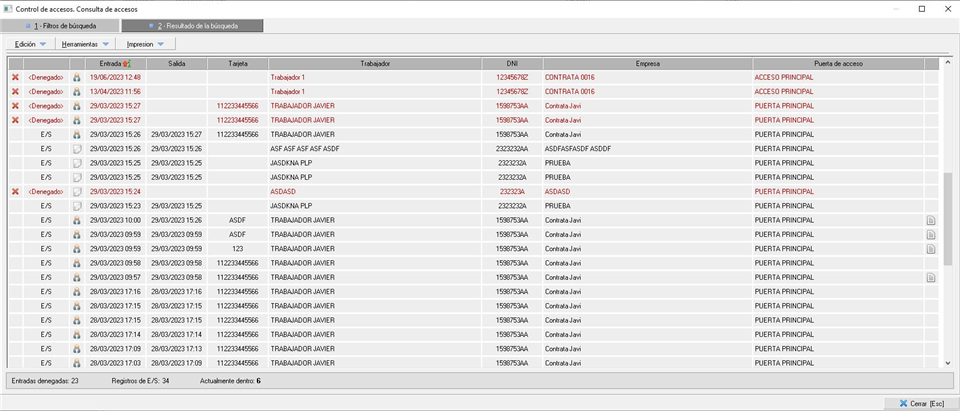 - Tipos de acceso. Filtro para tener en cuenta el tipo de acceso registrado, entre los que podemos diferenciar los siguientes: solo entradas, solo salidas, solo entradas denegadas o los registros dentro de un rango de fecha que podemos establecer.
