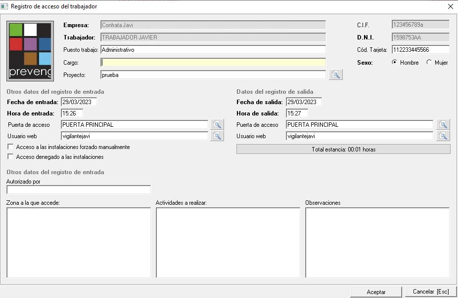 Podemos ver también los datos de la entrada y la salida, pudiendo comprobar la fecha, hora, puerta por la que ha accedido y el usuario de la web de control de accesos que le ha dado paso o lo ha rechazado. También podemos ver si el acceso ha sido forzado o denegado. De la misma manera podemos ver quien lo ha autorizado y si se ha indicado información sobre la zona a la que accede, las actividades que va a realizar y alguna observación.