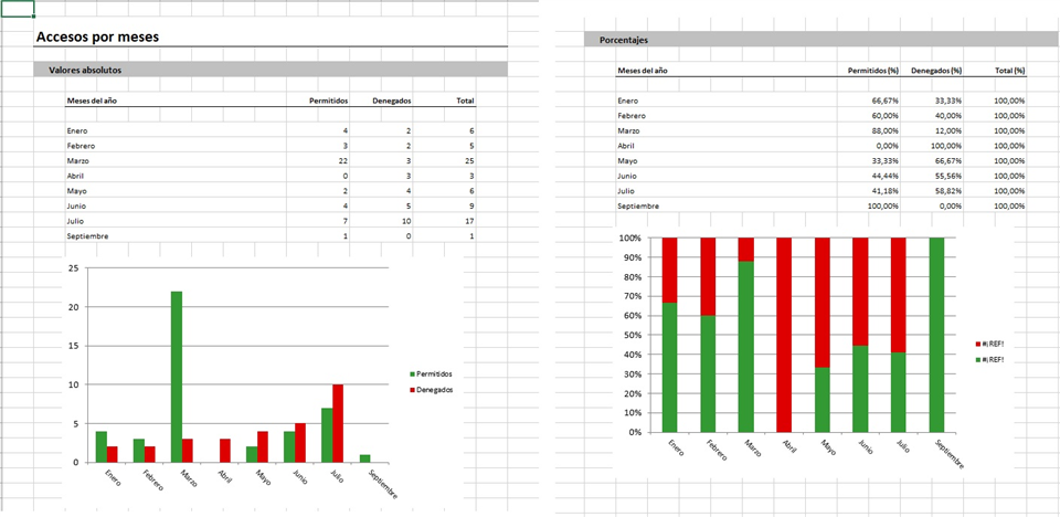 - Meses. Datos y gráfica con los accesos permitidos, denegados y el total por meses del año