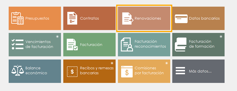 La renovación de un contrato la puede realizar desde el apartado de administración de la ficha del cliente correspondiente, o puede de forma masiva desde la consulta de renovaciones. A continuación, veremos como hacerlo desde ambos sitios.