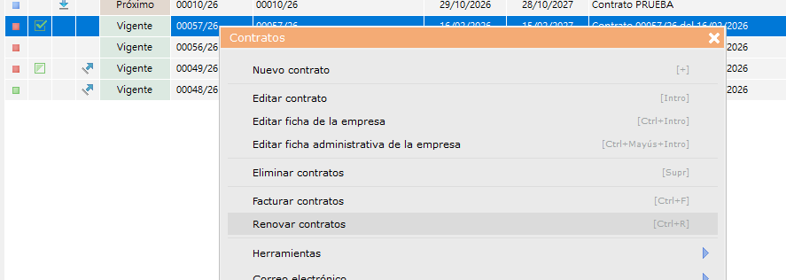 - Contrato: Al renovar se genera un nuevo contrato, por defecto, con la misma duración y forma de pago que el contrato inicial.