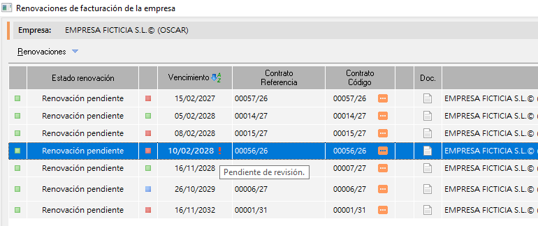 El sistema facilita el seguimiento de los contratos susceptibles de renovación mediante avisos que alertan al usuario cuando un contrato se aproxima a su fecha de vencimiento. Esto permite anticiparse a la finalización del servicio y gestionar la renovación con el tiempo suficiente para evitar interrupciones en la actividad preventiva del cliente.