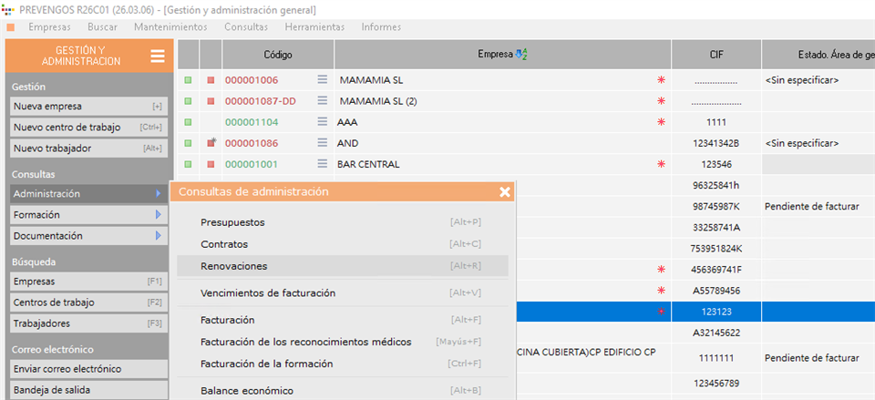 Dentro de la ficha del cliente tendremos que situarnos en el apartado de 'Administración' y posteriormente acceder al apartado '3. Renovaciones'. Una vez dentro del listado de renovaciones, debemos seleccionar los registros de renovación correspondientes a los contratos a renovar, y pulsar la opción "Renovar" que encontraremos en la parte superior del listado de renovaciones. La opción de renovar, también la encontraremos si pulsamos el botón derecho del ratón sobre el listado de renovaciones.
