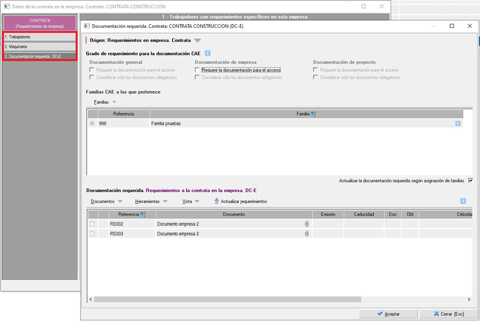En este caso hablaremos de la documentación que hace la empresa de forma general, por lo que sería válida para cualquier proyecto de dicha empresa. Para realizar este tipo de requerimientos, tendrán que hacerlo utilizando el apartado 'Contratas con requerimientos específicos' que encontrarán en el bloque 'Documentación CAE' de la ficha de datos de la empresa cliente. En este apartado tendrán que añadir a aquellas contratas a las que realizarán este tipo de requerimientos, y donde podrán especificarlos, tanto a nivel de contrata, como de sus trabajadores o máquinas.